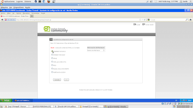 Aquí debemos configurar la interfaz del servidor que se supone debe ir a la WAN, esta sera nombrada como la zona roja, dependiendo de nuestra conexión, en este caso seria ETHERNET STATICO. Y se supone deberiamos tener tres interfaces o mas.